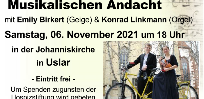 Musikalische Andacht am Samstag, 6. November 2021 um 18 in Uslar in der Ev.-luth. Kirche St. Johannis, Graftplatz (Plakat, Programm) und Sonntag, 7. November 2021 um 18 Uhr in Northeim in der kath. Kirche Mariä Heimsuchung, Breiter...